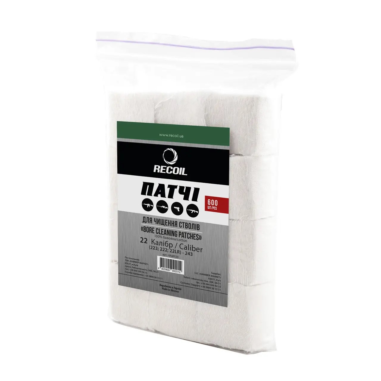 Патчі від торгової марки Recoil виготовлені з високоякісної бавовни. Дозволяють швидко і надійно вичистити ствол практично будь-якої стрілецької зброї, представленої на ринку. Призначений для чищення калібру 22 (223, 222, 22LR) – 243. Кількість в упаковці – 600 шт.